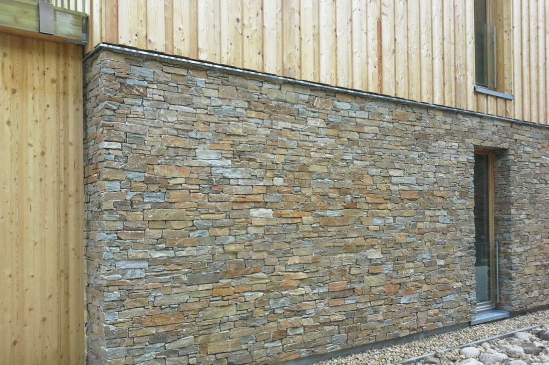Kompletní dodávka a montáž obkladu fasády čtyř bytových domů ve Špindlerově Mlýně – Apartmány Medvědín. Rozsah zakázy 3000 m2. Kombinace přírodních materiálů dřeva a kamene ve stejně sladěných odstínech v souladu s okolní přírodou. Materiál Rula Rusty, segmentové obklady.